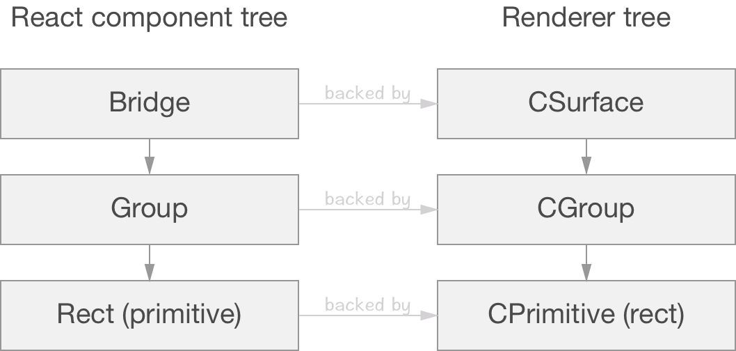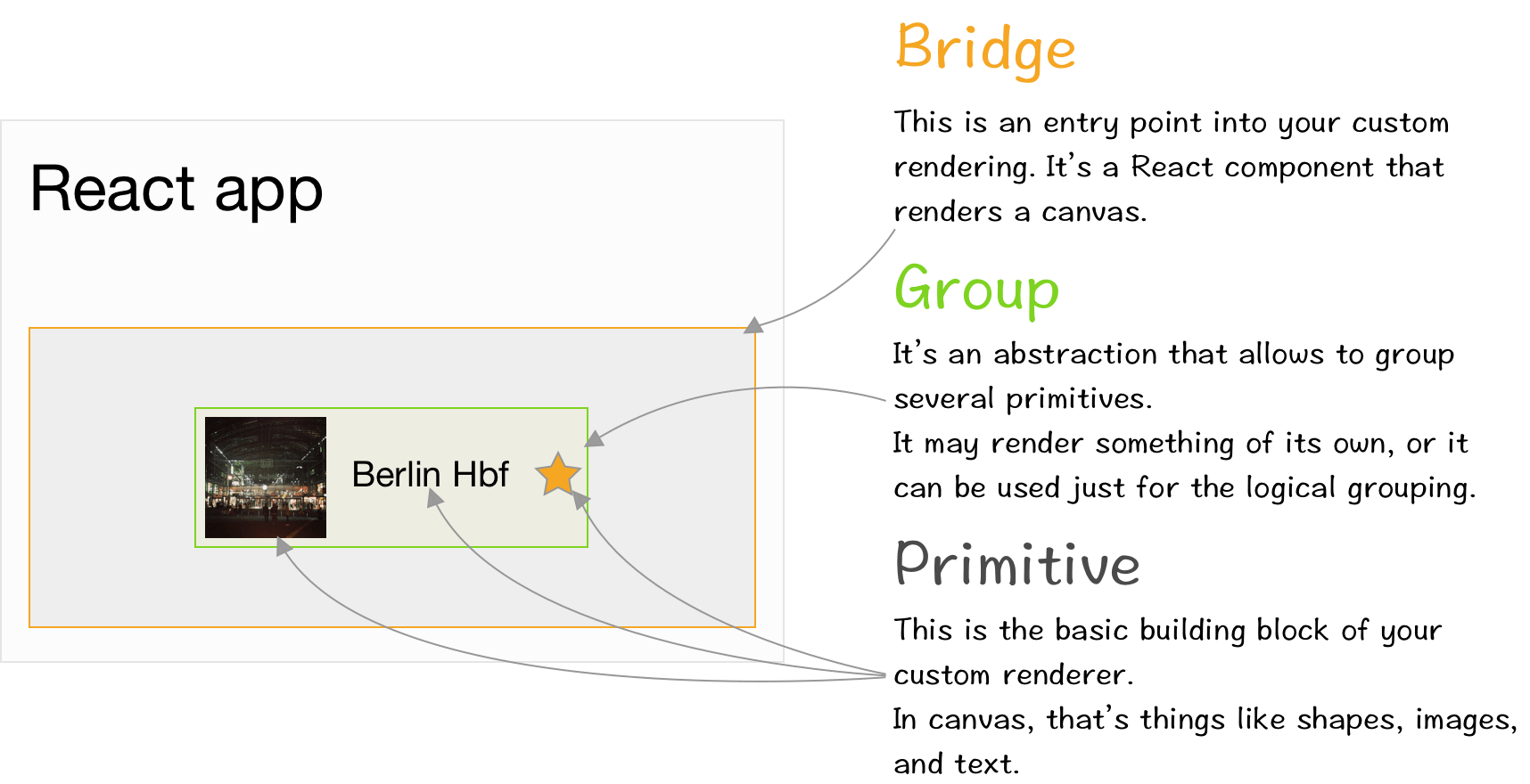 This is what you use to bridge primitives with React. In case of canvas, primitives will be like a rectangle, an image, a line of text, a line.